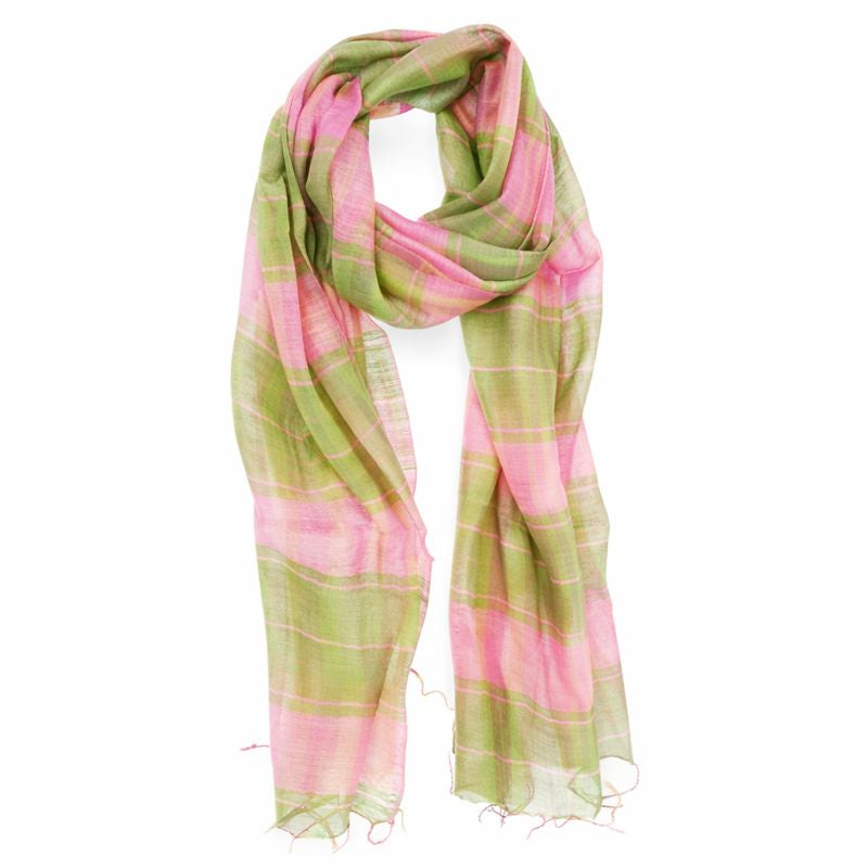 Pink & Green Plaid Silk-Blend Scarf with Tassels